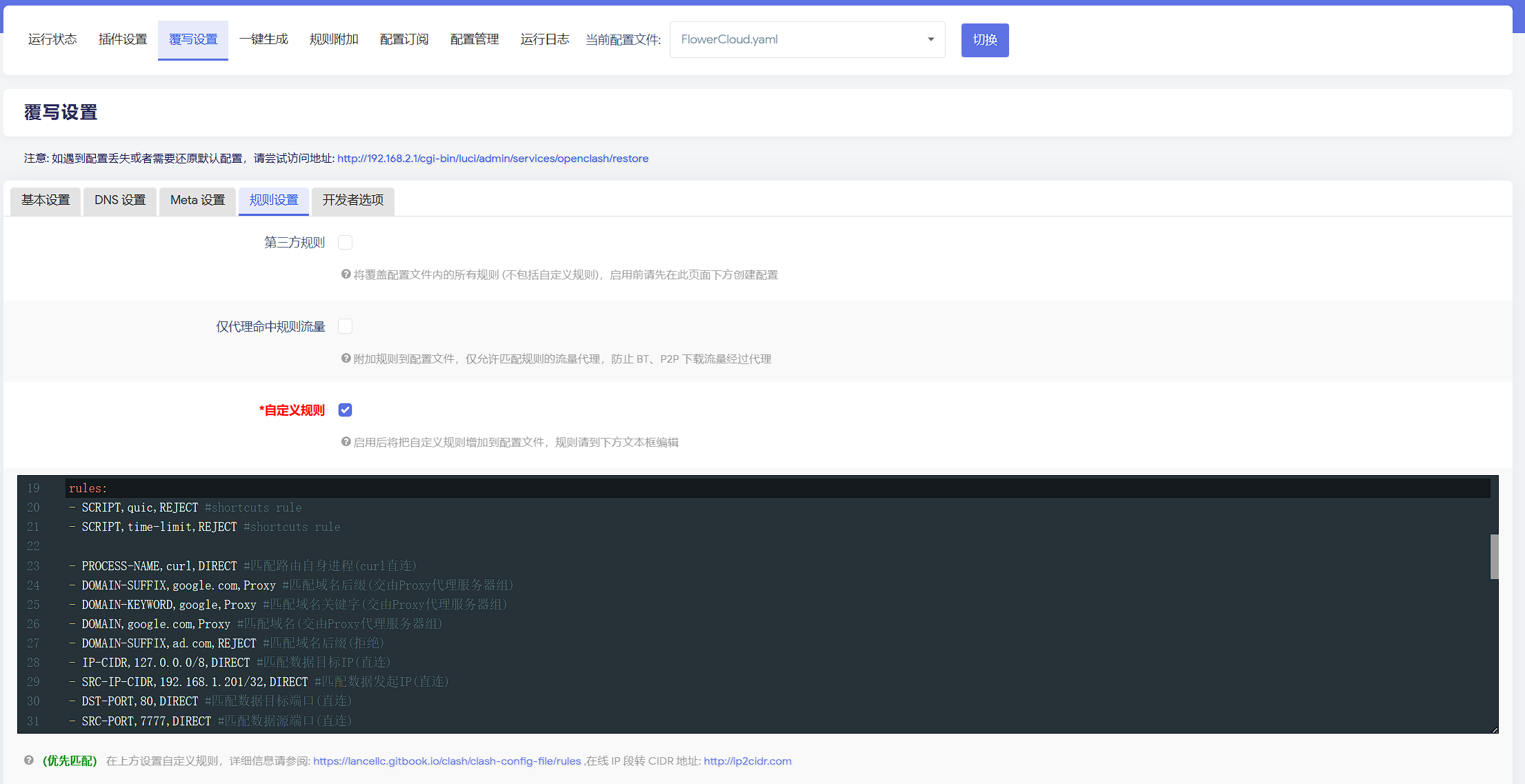 > 例如`- SRC-IP-CIDR, 192.168.1.3/32, DIRECT`代表如果是局域网内设备IP为192.168.1.3发起的请求直连,不经过代理。